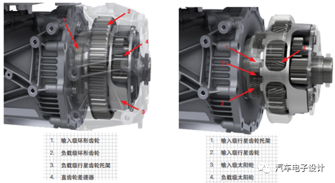 输入级唤醒齿轮组在前桥变速箱以第一传动比起作用,负载级行星齿轮脱家同时承担直齿轮差速器驱动,来自前面两部分的扭矩传递到直齿轮差速器的托架,整个前轴变速箱通过内部的机油浸润进行冷却,热量通过法兰表面和螺栓连接释放到电机壳体,前驱电机是有冷却套管的,通过冷却液主动冷却