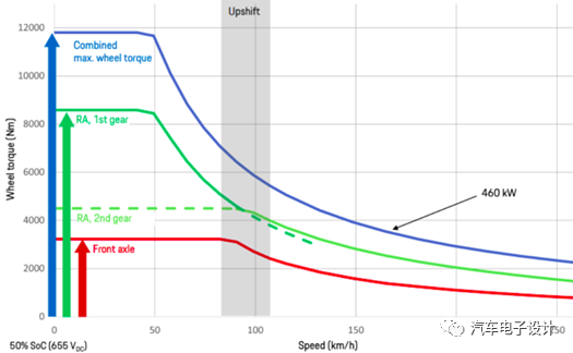 这个变速箱的整体工作逻辑,如下图所示:绿色线为后轴输出,深绿为一档、浅绿为二档,红色表示前轴输出,蓝色表示综合输出。换挡区域根据不同的模式来切换,一档的扭矩输出逐渐下降与二档曲线公里每小时的速度,由换档后的扭矩输出继续让车辆加速。