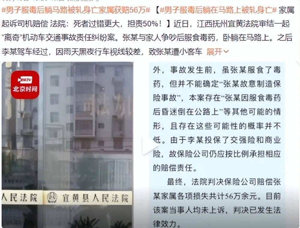 经过一番争执,双方各执一词,法院最终作出了判决:张某与司机李某各自承担50%的责任,保险公司则需要赔偿张某家属损失共计56万余元。判决一出,舆论哗然,许多网友表示不解,认为司机真是倒了大霉,这简直是天降横祸,可能会留下心理阴影。也有网友提出,难道应该是司机起诉张某家属赔偿吗?张某家属难道不该追究毒药生产厂家的责任吗?毕竟是张某先服毒才躺在马路上的。